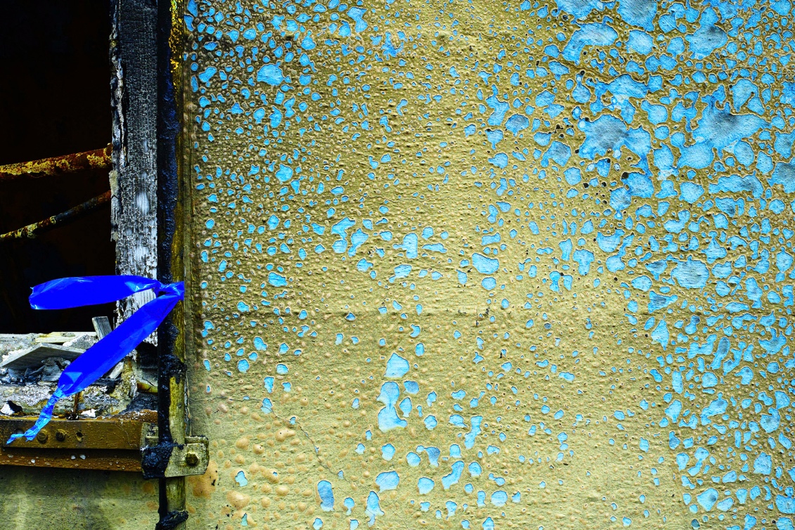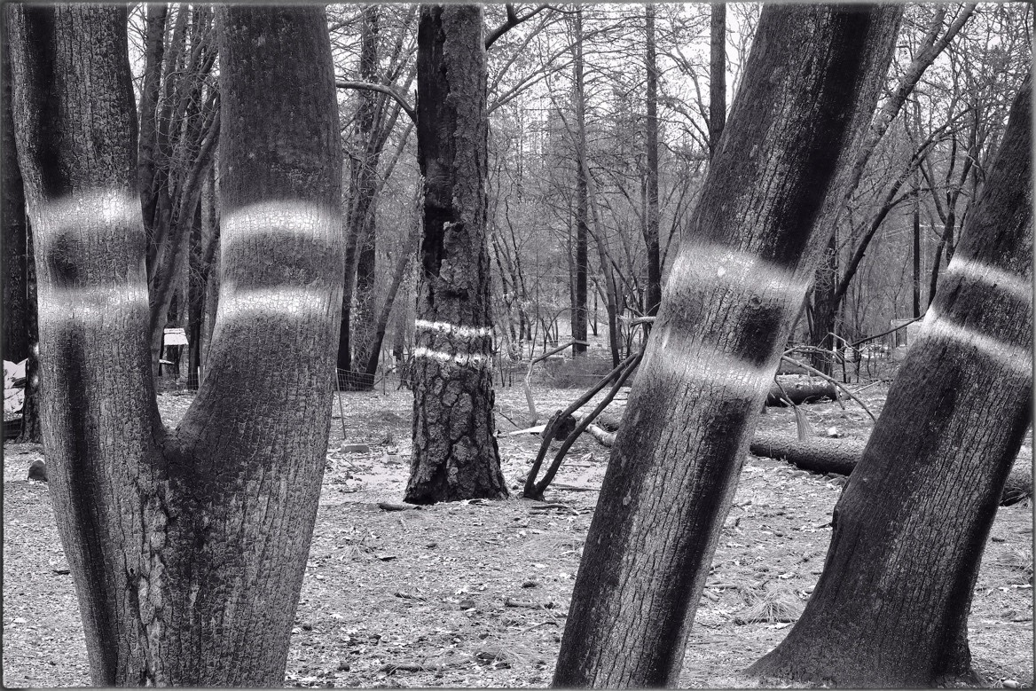 In David and Tamara’s yard a trencher of Ponderosa bark aflame and spinning flies past out of the smoke, striking and igniting the wisteria, the manzanita, grey pines, raked piles of needles along the top of the driveway, then the house itself; and as the fire is no longer new here but circling back in some way, what also flies by is a piece of someone else’s burned home, a fragment of board and batt, lapstrake, cabin wall, cedar mansion kit home, stucco, chicken wire and shreds of flaming one by six, pieces of barns, trailers, a one foot square of presswood veneer spinning sideways, wobbling out of the dark, its grooves 12 inches on center aflame with a patch of pink insulation and panel shard to the meltable but not strictly flammable metal skin of the mobile home from which it’s been ripped. In the wind before it rises to its loudest level, the locomotive roar of the canyon-filling fire, there’s a quieter moment as it’s coming, heralding the katabasis on its way, the voyage through the underworld for everyone here today, sussurus, coruscation, and excoriation; the fire’s boss and motto could read whisper, shine, flay.